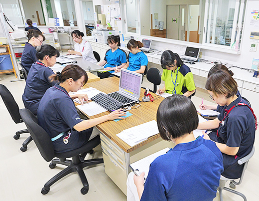 栄養管理室は、管理栄養士を各病棟に配置し、病棟担当制のもと、多職種と連携しながら栄養管理や栄養指導業務を行う他、献立作成など食事療養業務を行っています。