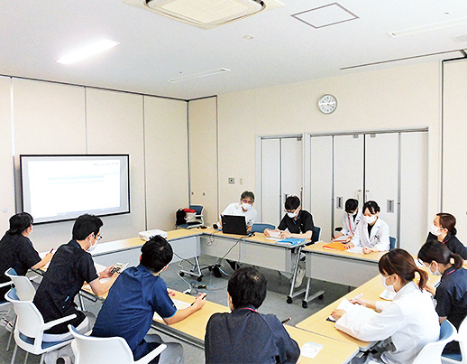 医師、看護師、管理栄養士、薬剤師、理学療法士、臨床検査技師等多職種で入院患者さんの栄養状態改善に向けてカンファレンスを行っています。