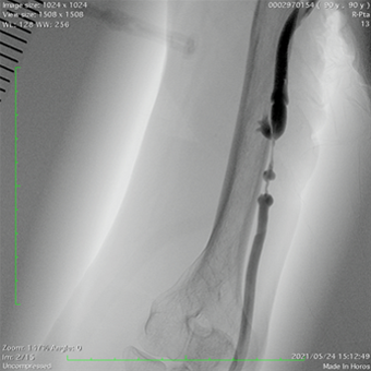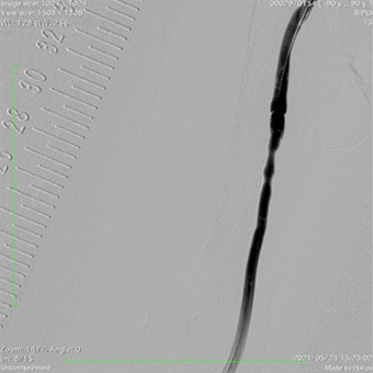 当院では透析専門医および日本IVR学会専門医が在籍しており、透析関連において透析シャント不全(自己血管、人工血管)に対するバルーン拡張術(PTA)による治療法を積極的に施行し、県内でも豊富な治療経験数を有する施設となっています。造影剤アレルギーのある方は超音波ガイド下(US)で施行しており副作用の心配はありません。最近では透析シャントの開存率の向上を目的とした最新治療法を積極的に導入しています。自己血管シャント頻回狭窄に対しては、薬剤コーティングバルーンカテーテルを併用しバルーンに塗布された薬剤(パクリタキセル)をバルーン拡張により血管壁に付着させ、再狭窄を抑制する治療法を選択しています。