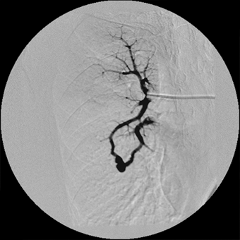 肺動静脈瘻(肺動静脈奇形)は肺に血液を送る肺動脈と肺から血液を送り出す肺静脈が異常な血管で直接吻合する病気で、息切れなどの低酸素血症、肺出血、脳梗塞、脳膿瘍などの原因となり、血管径が2-3mmであると積極的な治療が必要となります。遺伝的要因で家族内発生することもあります。最近では手術よりもIVR治療による金属コイルにて異常血管を塞栓する(詰める)治療法が標準となっています。