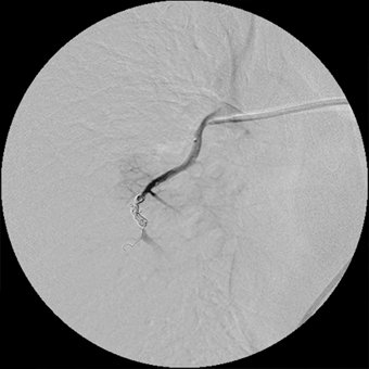 代表的な疾患としては肝癌に対する化学塞栓療法(TACE)、腹部内臓動脈瘤に対する金属コイル塞栓術等を施行しています。腹部内臓動脈瘤はCTや超音波検査にて偶然に発見されることの多い病気です。動脈硬化や線維筋異形成症などに合併しやすく、脾動脈や肝動脈、腎動脈、膵動脈に多く見られます。症状(出血、圧迫症状)がないことも多いですが、妊娠可能年齢や瘤径増大するもの、サイズが大きいもの(一般的に2-3cm以上)は治療対症となります。外科手術よりもIVR治療によるコイル塞栓術やステントグラフト治療が有効です。膵動脈では破裂の危険性が高いために大きさに関係なく発見した時点で治療考慮することがあります。