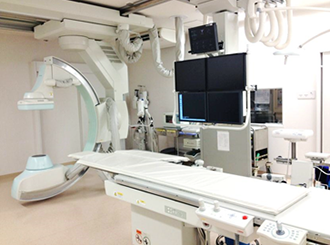 心臓カテーテル検査やペースメーカーをはじめ、透析内シャント狭窄に対する血管形成術、脳血管撮影、末梢血管撮影、胸部腹部血管撮影およびIVR治療までを行っています。FPD(フラットパネルディテクター)を搭載しており、低被ばくで高画質な画像を得ることが可能になりました。